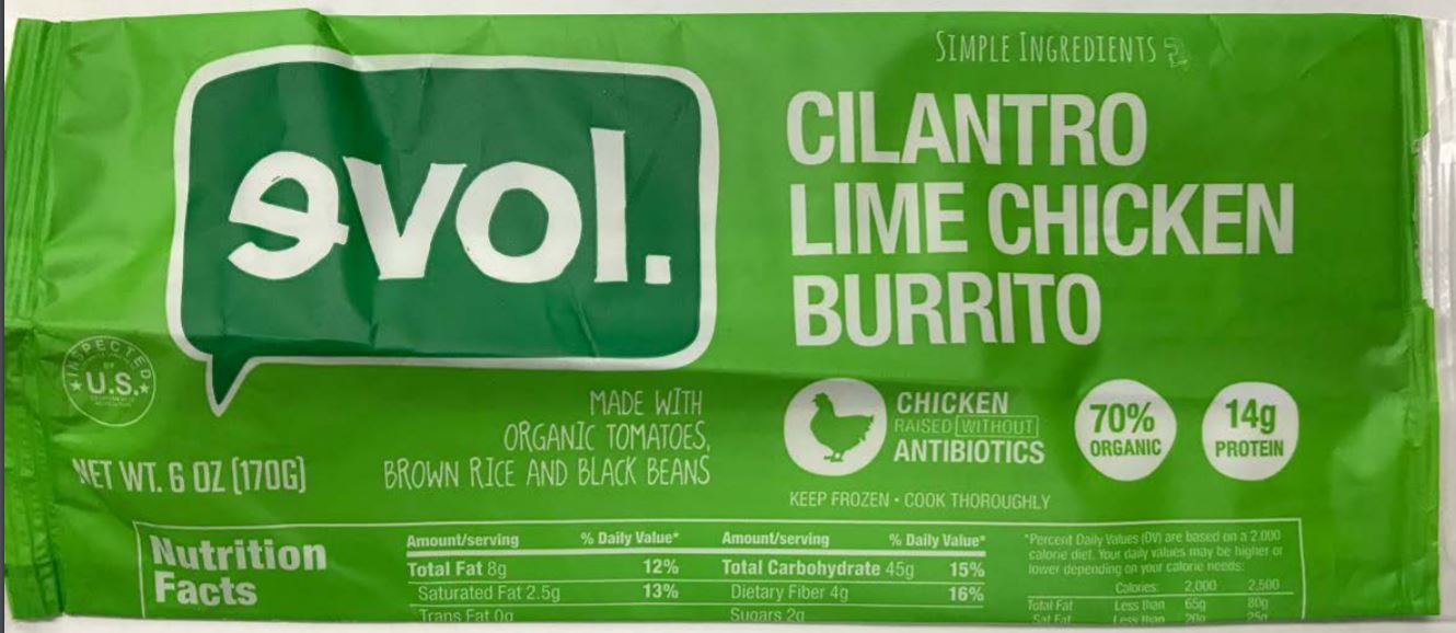 - 6-oz. packages containing “evol. CILANTRO LIME CHICKEN BURRITO” with lot code B9253 J1 P6009 and “BEST BY 03 MAR 2021CB” represented on the label, and Item #00300, Lot CB03031C11 and “BB: 03MAR2021-CB” on the case.